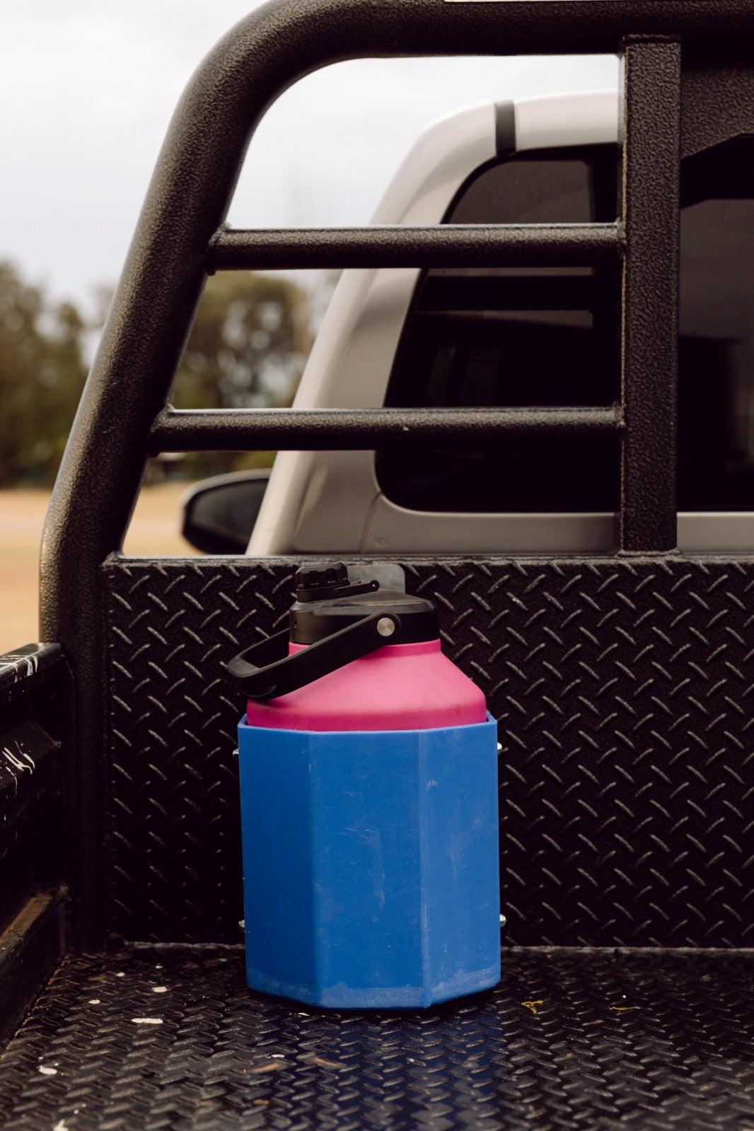 The Gallon-Mate is a product designed to hold a water bottle to ensure it doesn't roll around or dented while you're driving/ working outdoors.