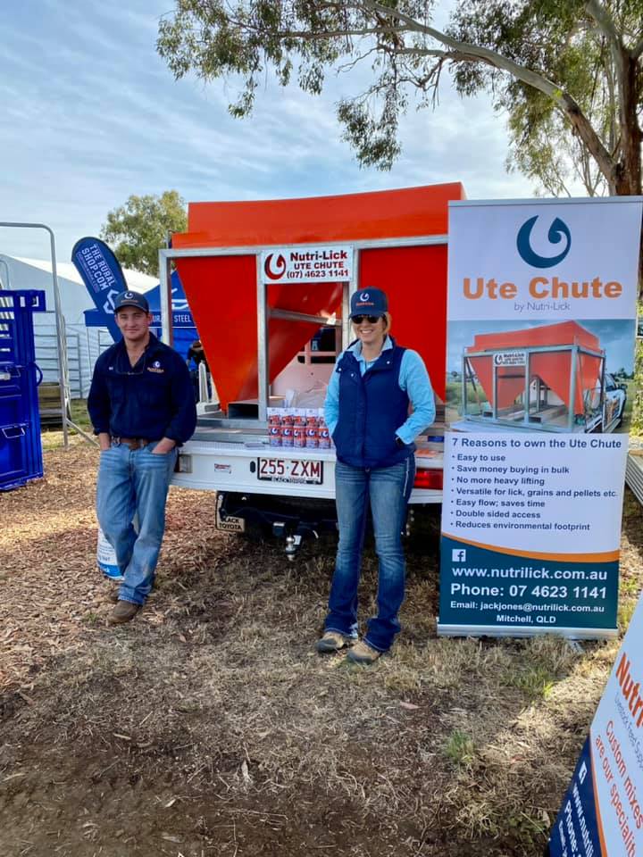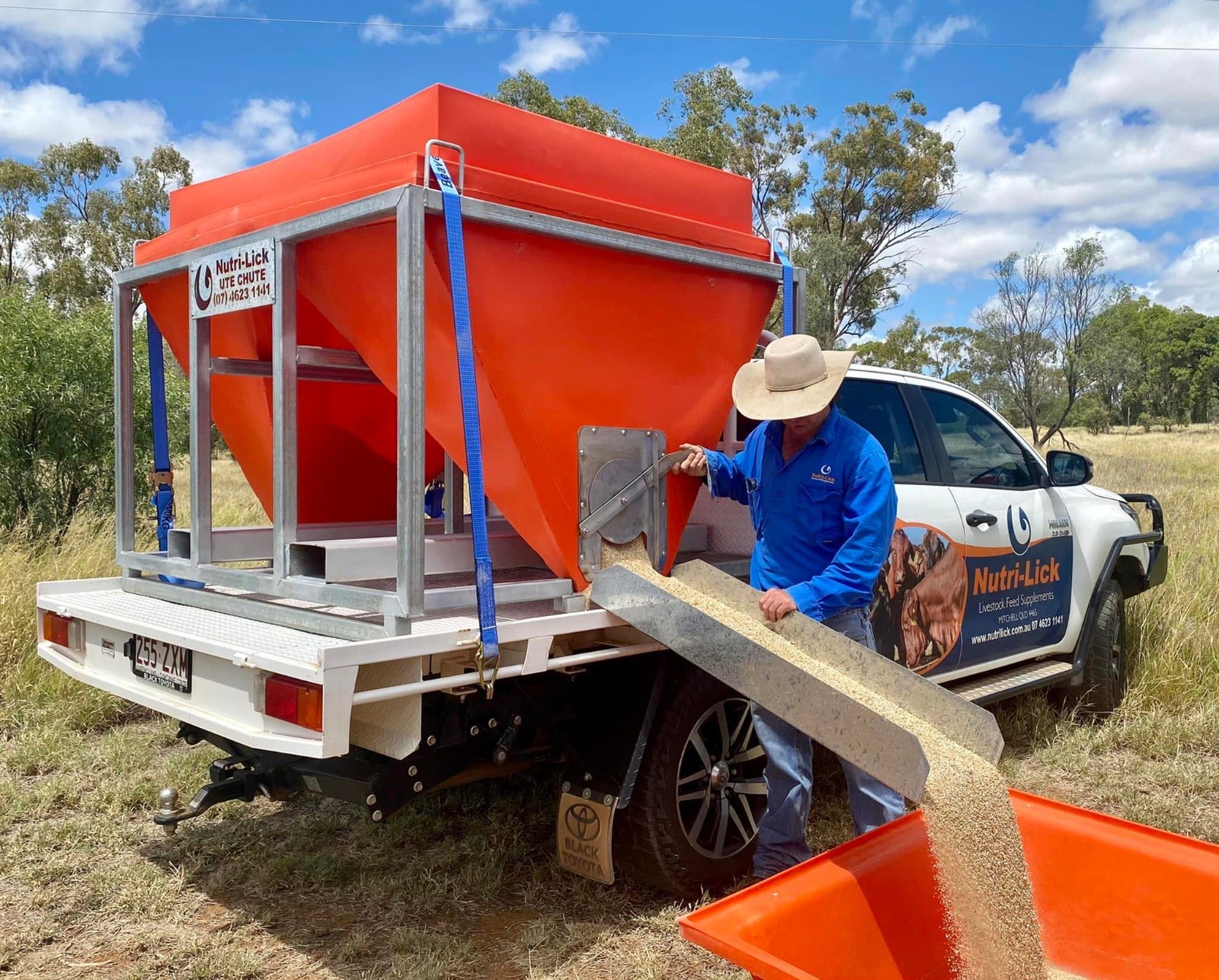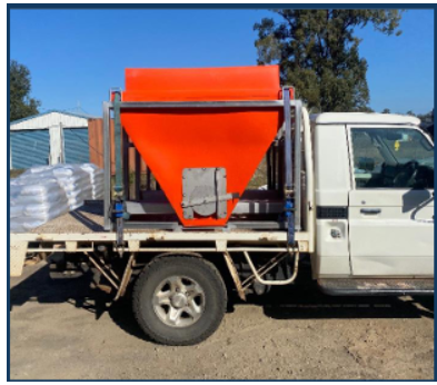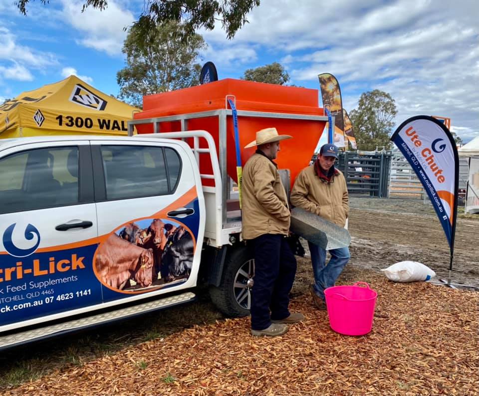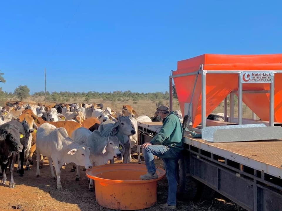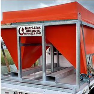 The Ute-Chute is a purpose-built design that transports and dispenses supplements directly from the ute to a feeder.